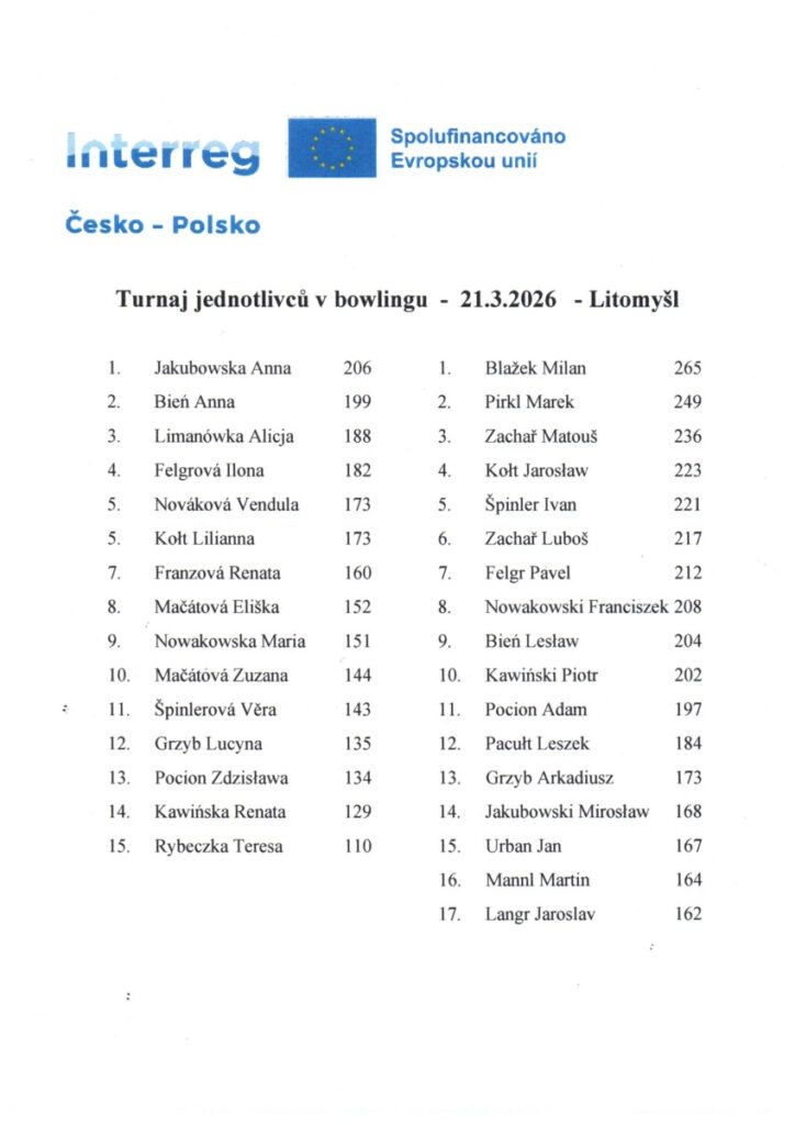 INTERREG Česko-Polsko, turnaj jednotlivců v bowlingu se uskutečnil v sobotu 21.03.2026 v Litomyšli, kdy se bowlingové dráhy staly na 3 hodinky bojištěm hasičů a hasiček z Polska i Čech. Konečné výsledky poukázaly na úžasnou souhru, kdy se na prvních třech místech v mužské kategorii umístili hasiči z SDH Černovír a v ženské kategorii zase první tři místa obsadily ženy z OSP Stary Waliszów. Děkujeme městu Ústí nad Orlicí za zprostředkování tohoto turnaje a kamarádům z Polska za fajn večer a příjemné bowlingové zápolení.